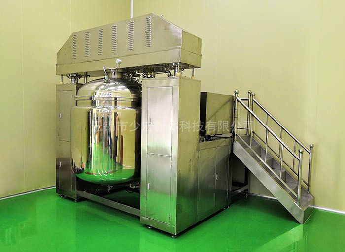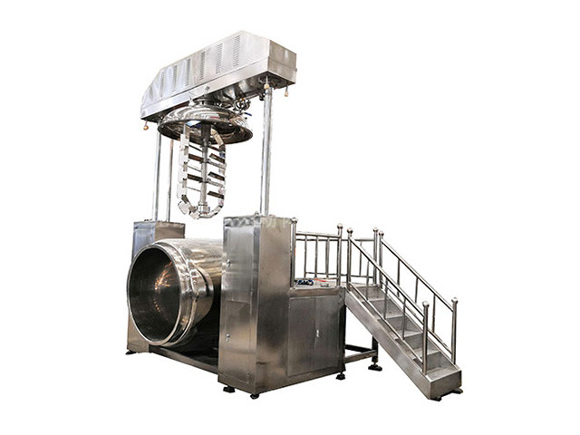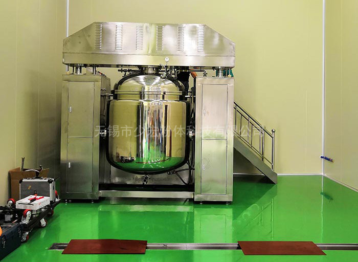 物料在水鍋、油鍋內(nèi)通過(guò)加熱、攪拌進(jìn)行混合反應(yīng)后,由真空泵吸入乳化鍋,通過(guò)乳化鍋內(nèi)上部的中心攪拌、聚四氟乙烯刮板始終迎合攪拌鍋形體,掃凈掛壁粘料,使被刮取的物料不斷產(chǎn)生新界面,再經(jīng)過(guò)葉片的剪斷、壓縮、折疊,使其攪拌、混合而向下流往鍋體下方的均質(zhì)器處,物料再通過(guò)高速旋轉(zhuǎn)的切割輪與固定的切割套之間所產(chǎn)生的強(qiáng)力的剪斷、沖擊、亂流等過(guò)程,物料在剪切縫中被切割,迅速破碎成200um-0.2um的微粒,由于乳化鍋內(nèi)處于真空狀態(tài),物料在攪拌過(guò)程中產(chǎn)生的氣泡被及時(shí)抽走。采用抽真空的方式,使所生產(chǎn)的制品在攪拌過(guò)程中不再混入氣泡,從而保證可制造出富有光澤、細(xì)膩及延展性良好的產(chǎn)品。